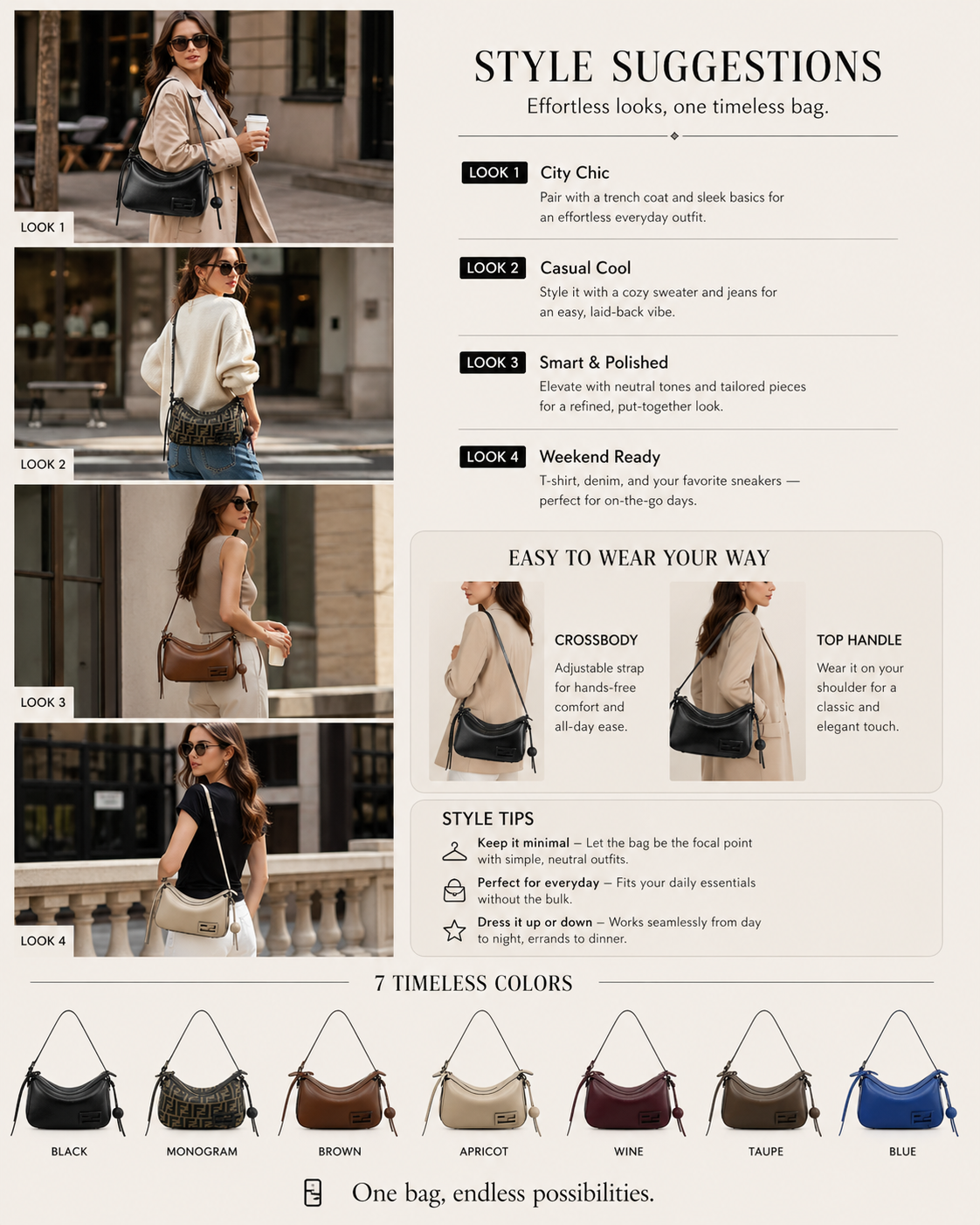 Designed for effortless styling, this compact crescent silhouette delivers just the right balance of fashion and function.