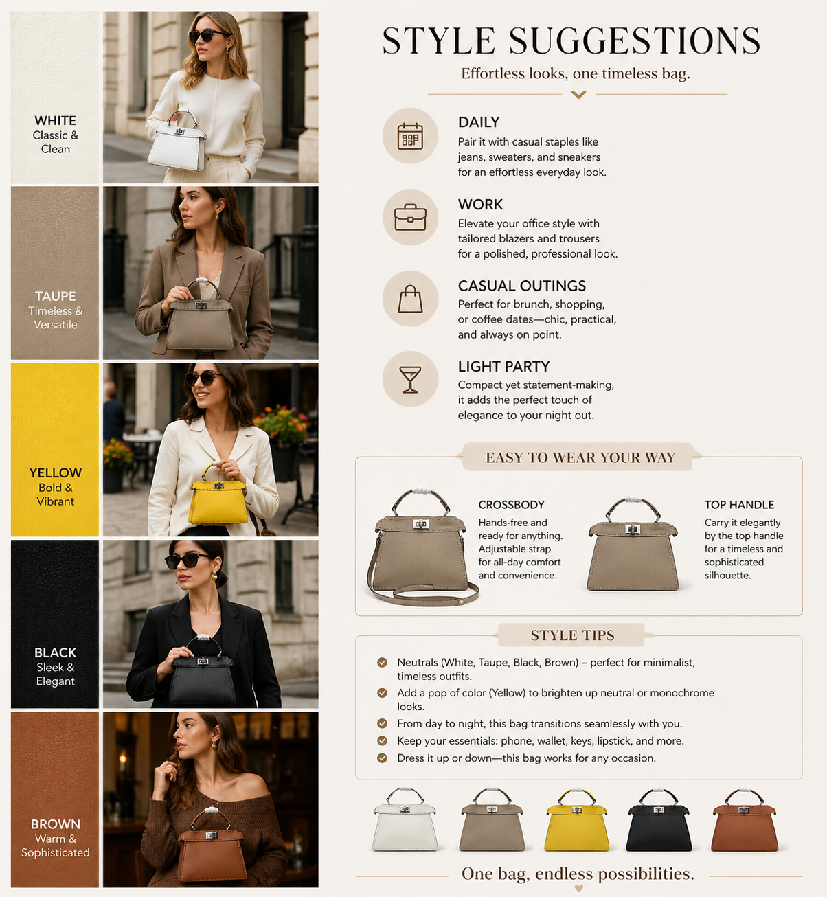 - Top handle + crossbody versatility – Carry it your way, from day to night